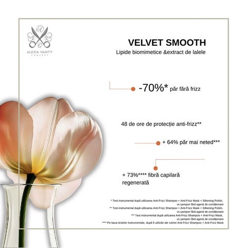 Solutia suprema pentru un par neted, fara frizz si rezistent la umiditate, samponul Velvet Smooth Anti-frizz este bio-proiectat pentru a curata parul in timp ce netezeste si inmoaie cuticula. Reface uleiurile naturale cu lipide biomimetice pentru stralucire si catifelare.